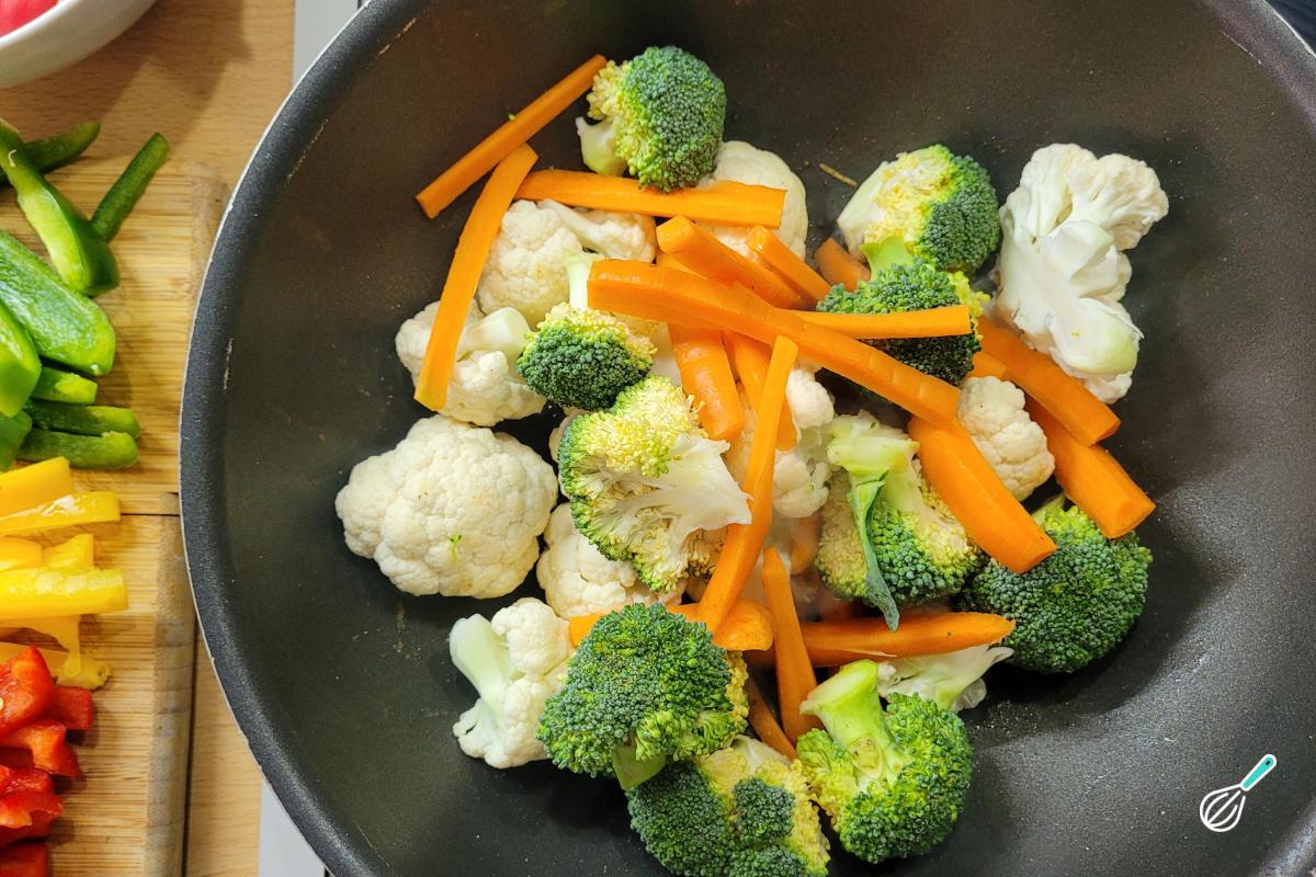 Reserve e na mesma frigideira vamos preparar os vegetais, começando por aqueles que demoram mais para cozinhar: o brócolis, a couve-flor e a cenoura.