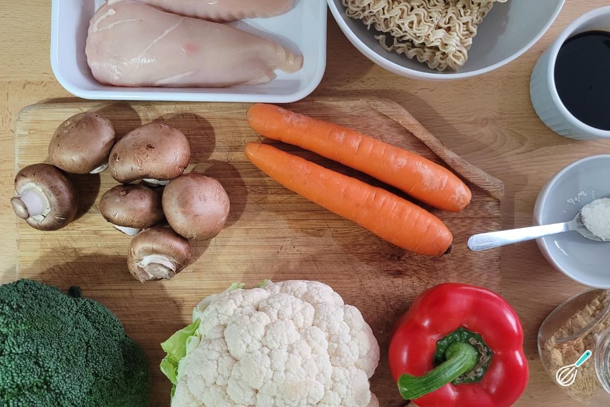 Separe os ingredientes para fazer seu Yakisoba de frango com legumes. Essa receita é super versátil e você pode variar com os legumes que tiver na geladeira. O macarrão para Yakisoba é um macarrão instantâneo que fica pronto em cerca de 3 minutos. É facilmente encontrado em lojas de produtos asiáticos, mas se não encontrar, pode usar um macarrão longo comum e cozinhar por mais tempo conforme indicado na embalagem.