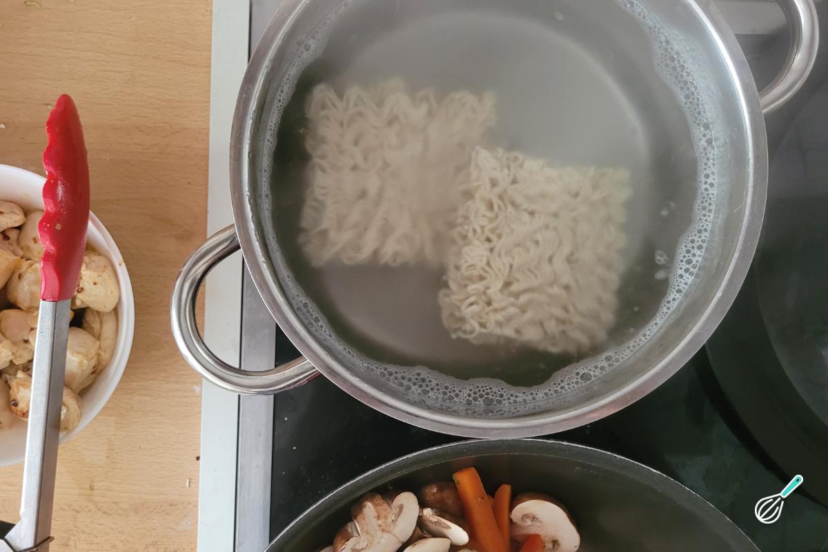Enquanto os legumes terminam de cozinhar, coloque o macarrão na água fervendo com um pouco de sal e cozinhe pelo tempo indicado na embalagem - o macarrão para Yakisoba cozinha bem rápido.