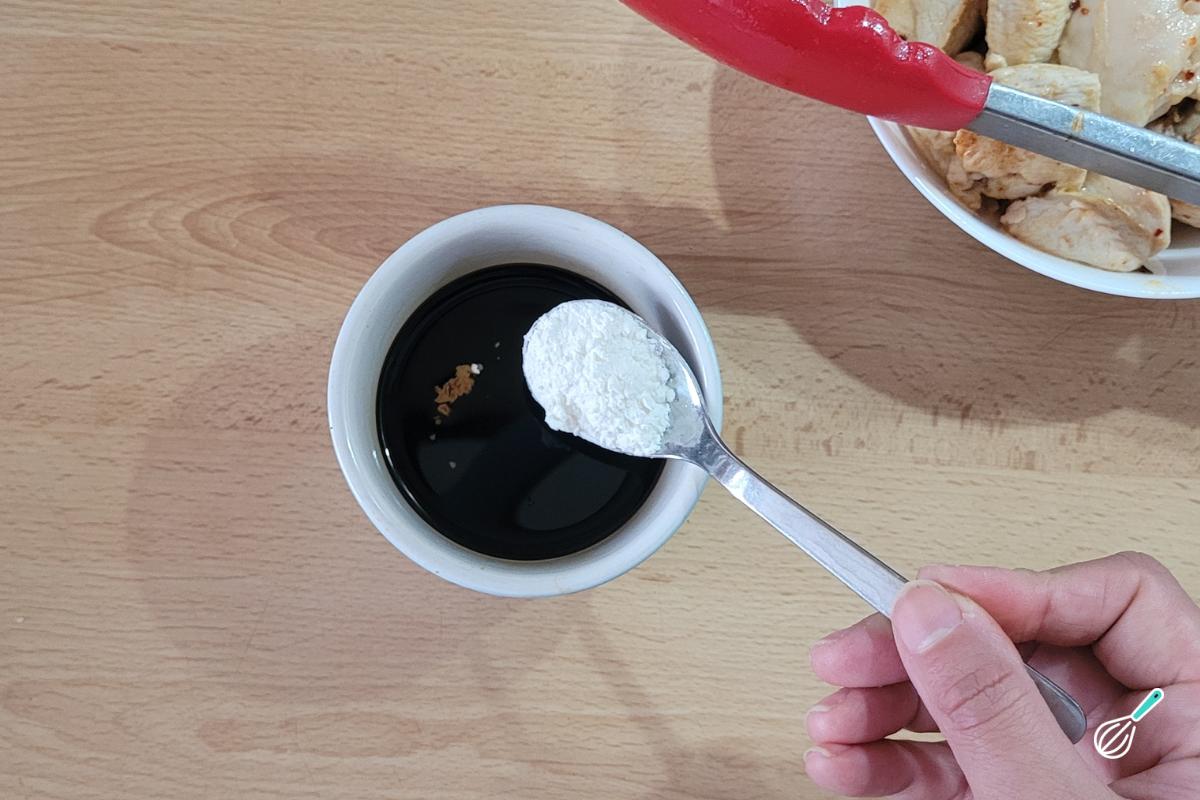 Enquanto isso, prepare o molho misturando o shoyu com o amido de milho.