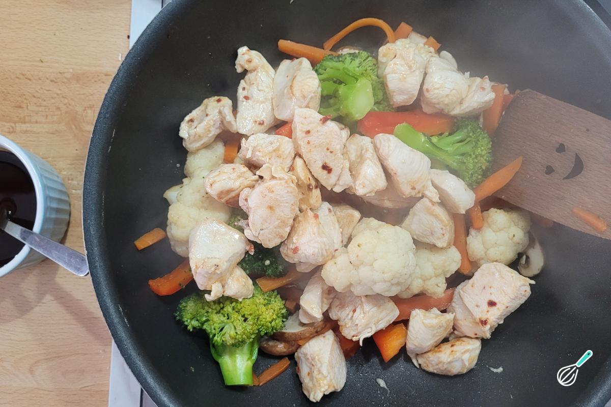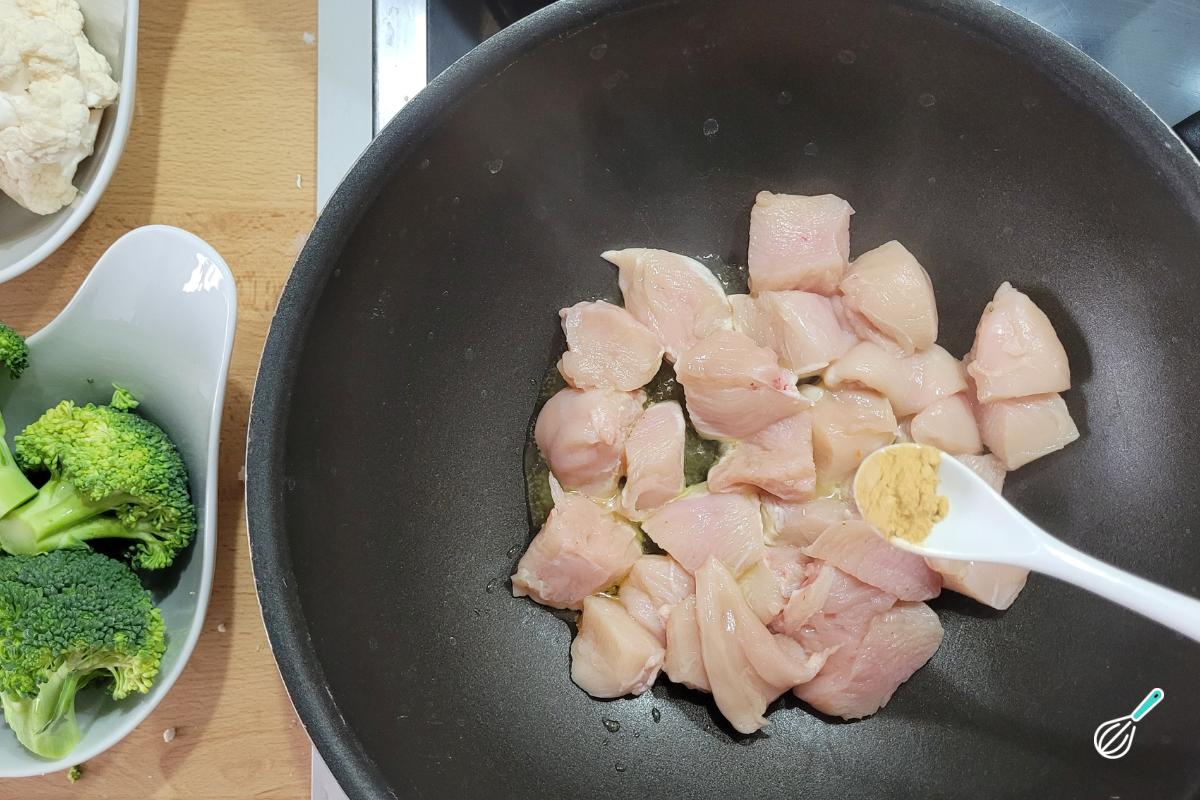 Todo o preparo será feito em uma única frigideira - então use uma frigideira grande e de preferência que tenha tampa - eu gosto de usar a wok, que é tradicional para preparos asiáticos. Leve o frango para dourar com um pouco de óleo neutro (ou óleo de gergelim). Tempere com gengibre em pó, sal e pimenta em flocos. Cuidado com o sal pois o molho à base de shoyu já é salgado.