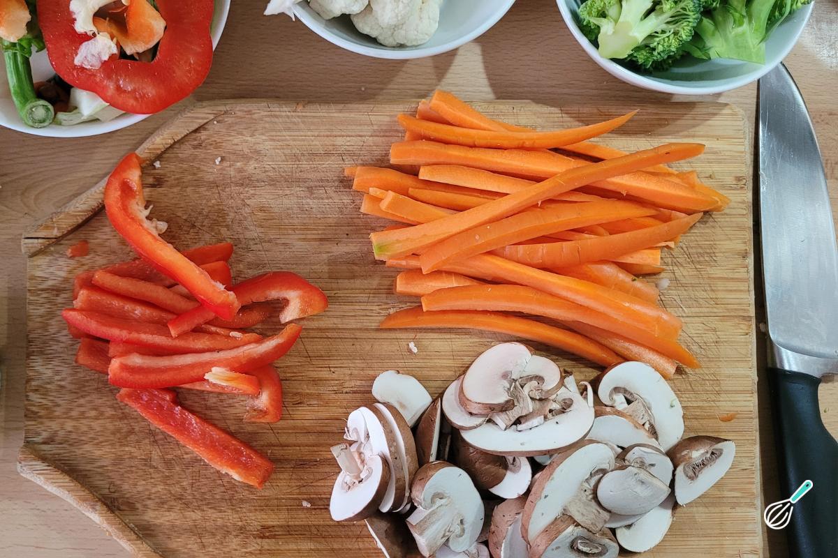 Corte o pimentão em tiras e os cogumelos em fatias. A cenoura gosto de cortar em tiras para que fiquem com mais textura no prato, mas se preferir, pode ralar - nesse caso, ela também cozinha mais rápido.