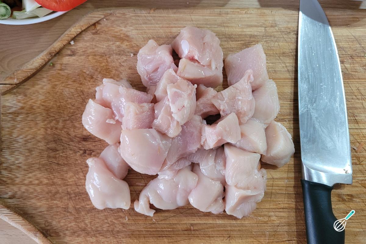 Depois que terminar de cortar os legumes, reserve e corte o frango - isso evita contaminação cruzada de usar a mesma tábua e faca para cortar o frango e os legumes. Pode cortar o frango em cubos ou tiras - gosto de cortar em cubos porque acho que fica mais delicado.