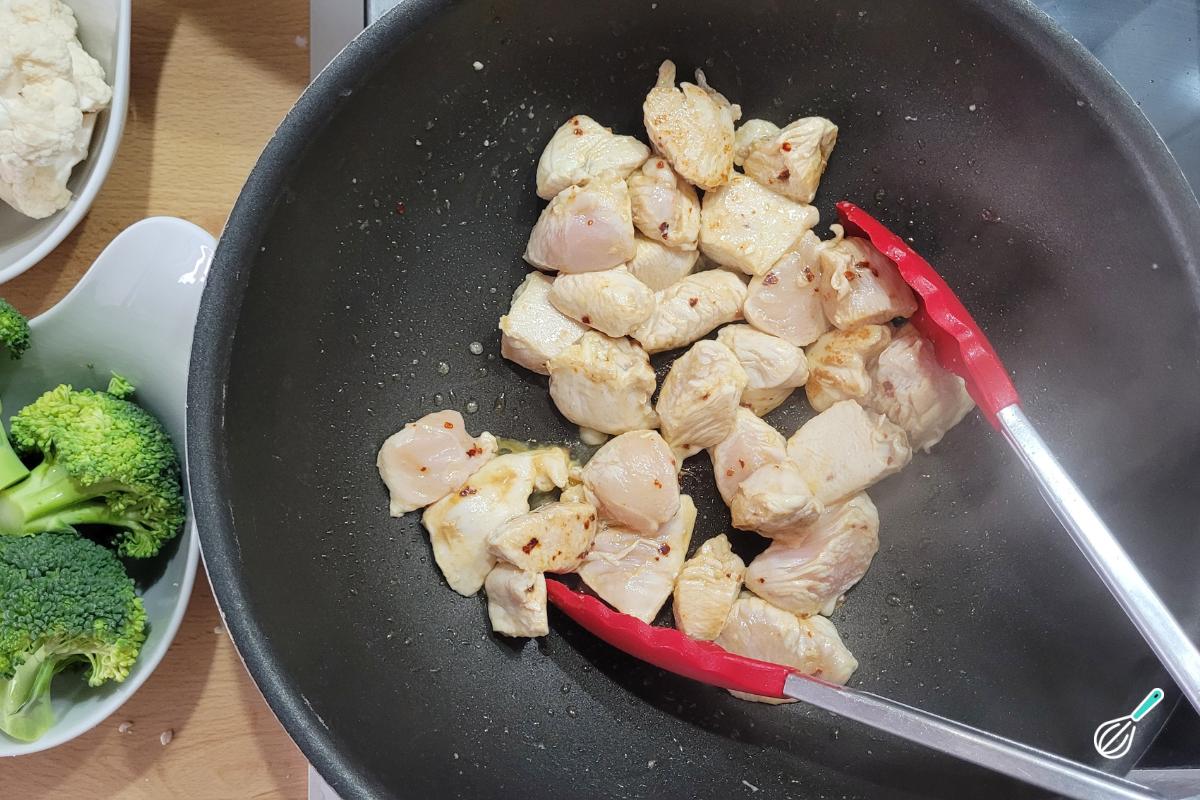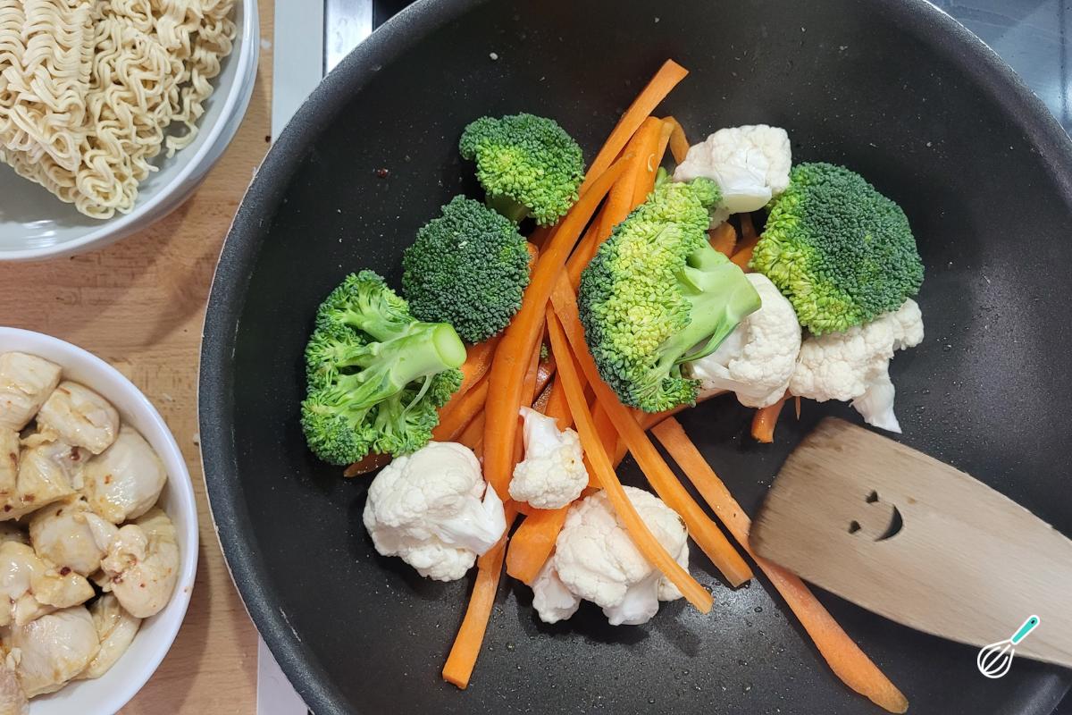 Quando o frango estiver dourado, reserve e vamos refogar os vegetais na mesma frigideira. Se necessário, coloque mais um tiquinho de óleo. Comece pelos vegetais que demoram mais para cozinhar - aqui no caso o brócolis, a couve-flor e a cenoura.