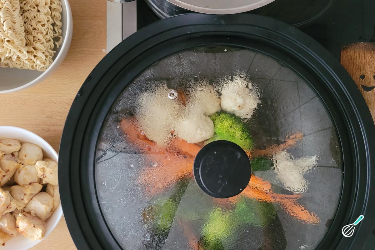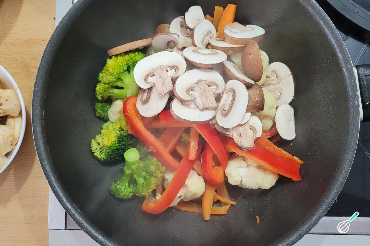 Deiex refogar um pouco e quando tiverem começado a dourar, coloque um pouquinho de água na frigideira e tampe. Isso cria um vapor que faz com que os legumes cozinhem mais rápido sem ficarem muito moles e perderem a textura.