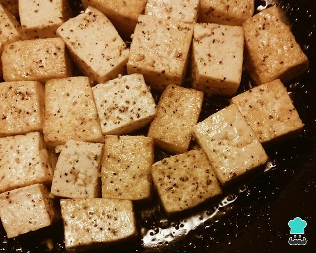 Numa outra frigideira ou panela salteie os pedaços de tofu em um pouco de óleo até ficarem dourados. Tempere a gosto com sal e pimenta do reino.