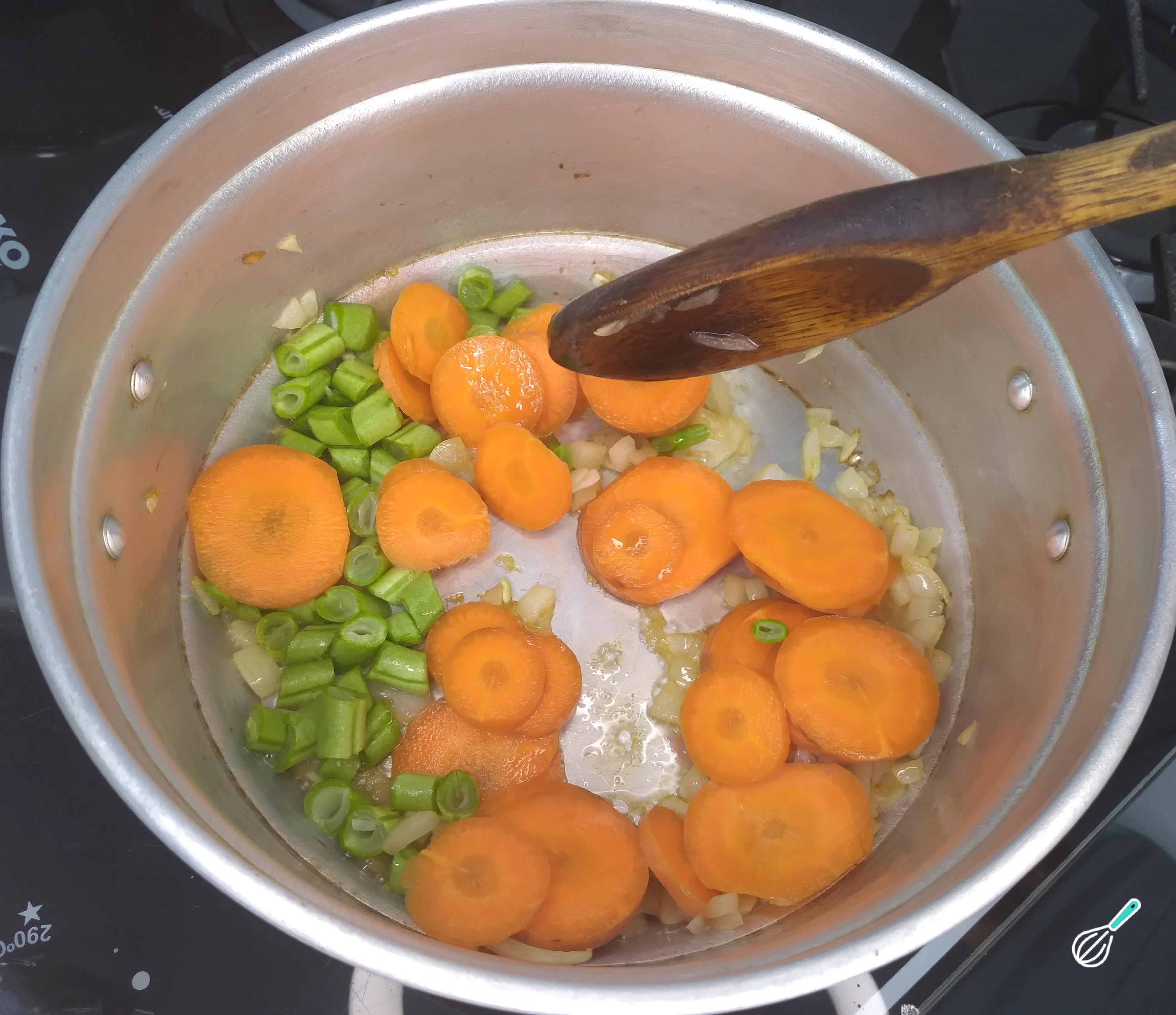 Feito isso, acrescente a cenoura e a vagem para refogar. Acrescente os temperos e sal.