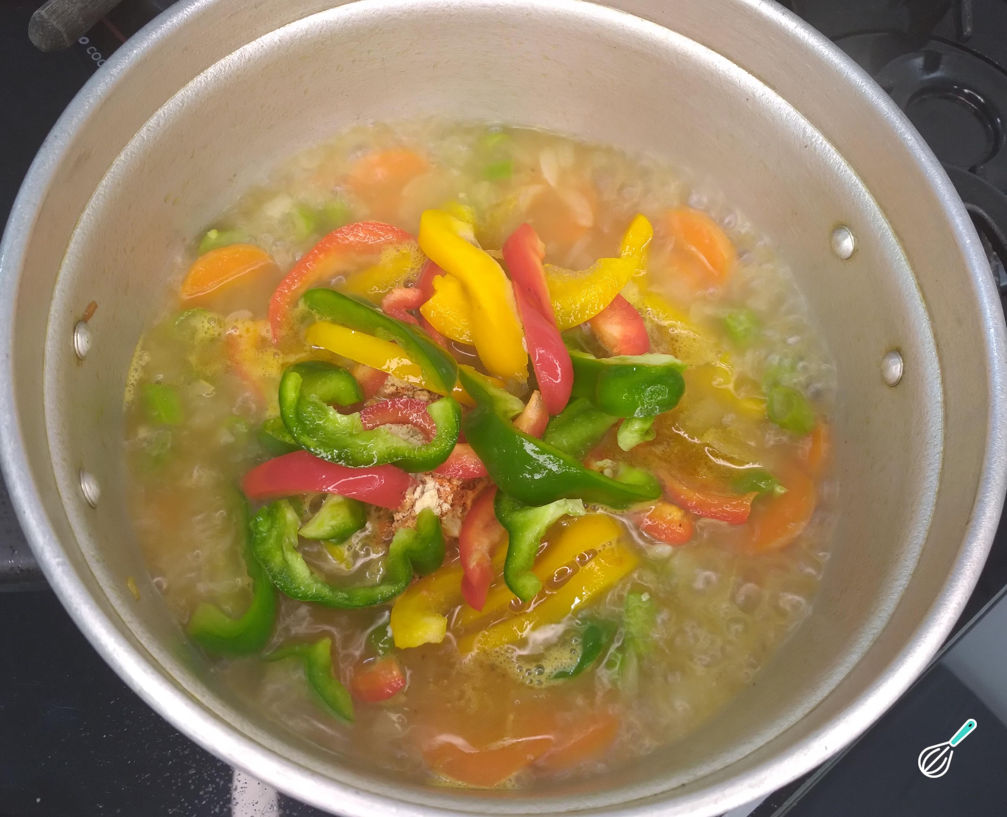 Depois de a cenoura e a vagem cozidas, ainda com água acrescente os pimentões cortados tiras.