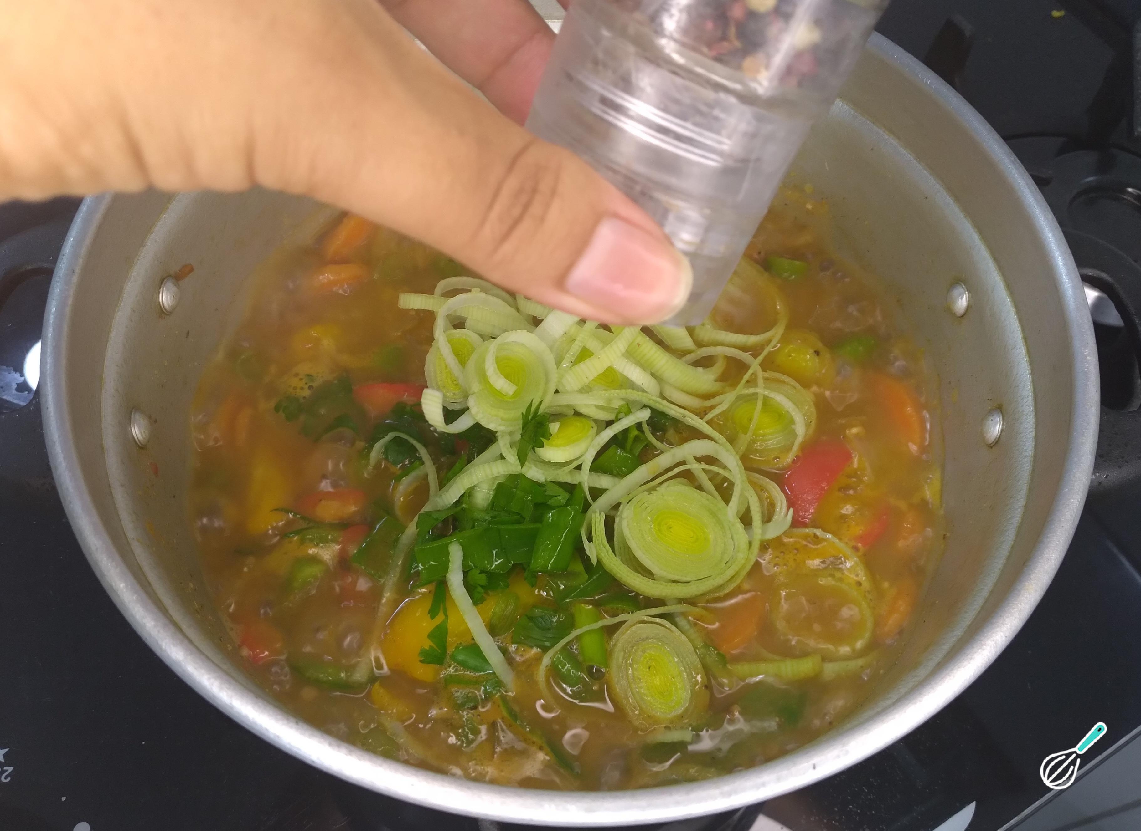 Assim que água estiver secando, acrescente o alho poró e a cebolinha e salsinha picadas.